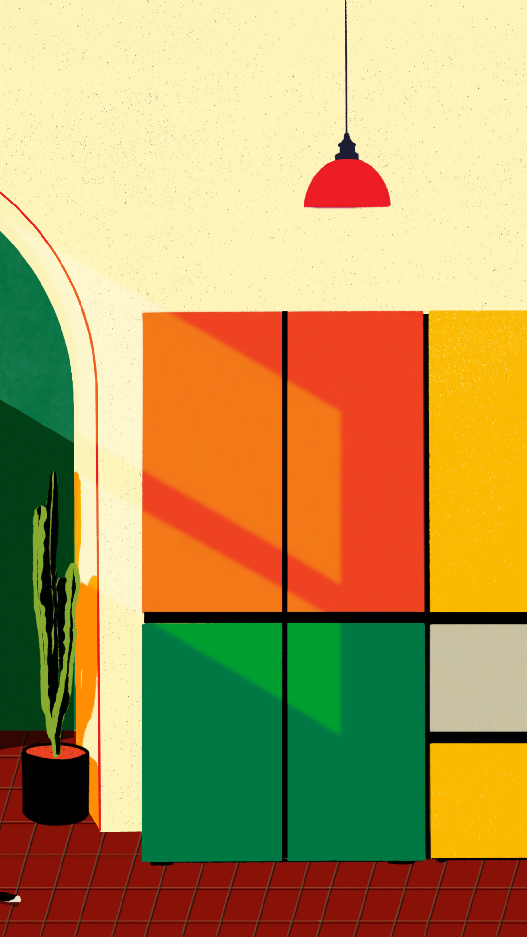 The colours chosen and the typography used in the motion graphic video were based on the vivid palette used in the artwork, whilst the letter “E” was designed to mimic the refrigerator door, hence placing two squares.